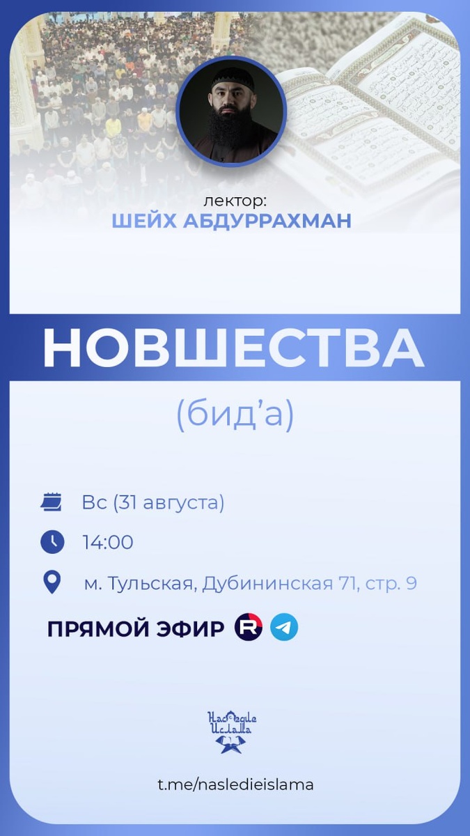 Прямой эфир пройдет на нашем канале "Наследие Ислама" в TELEGRAM и RuTube
