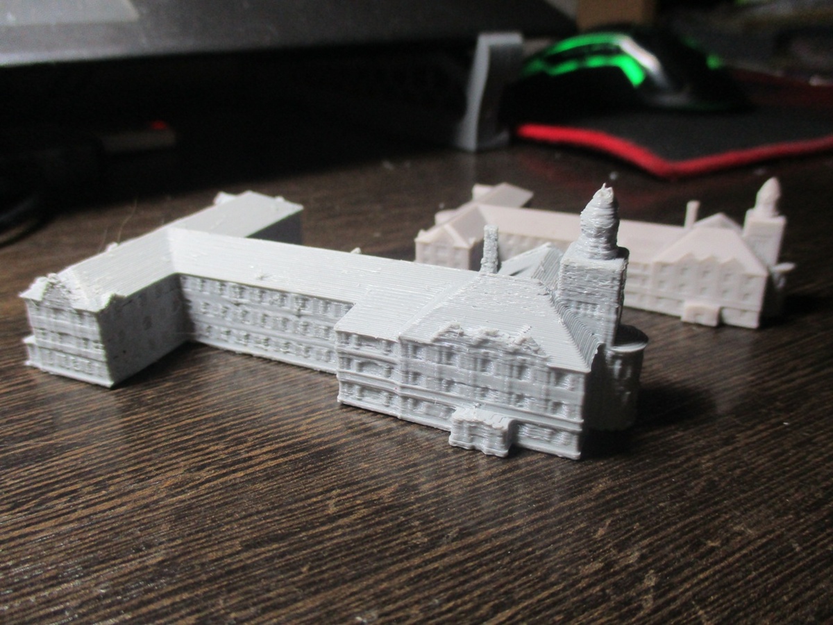 Напечатал на своём принтере уже доделанную модель техникума,размер в длиной около 10 сантиметров(серый цвет) и около 7,5 сантиметров заказывал печать из смолы(цвет типо беж). если кого то заинтересовал,можем и напечатать,из группы ВК уже заказали макеты из смолы