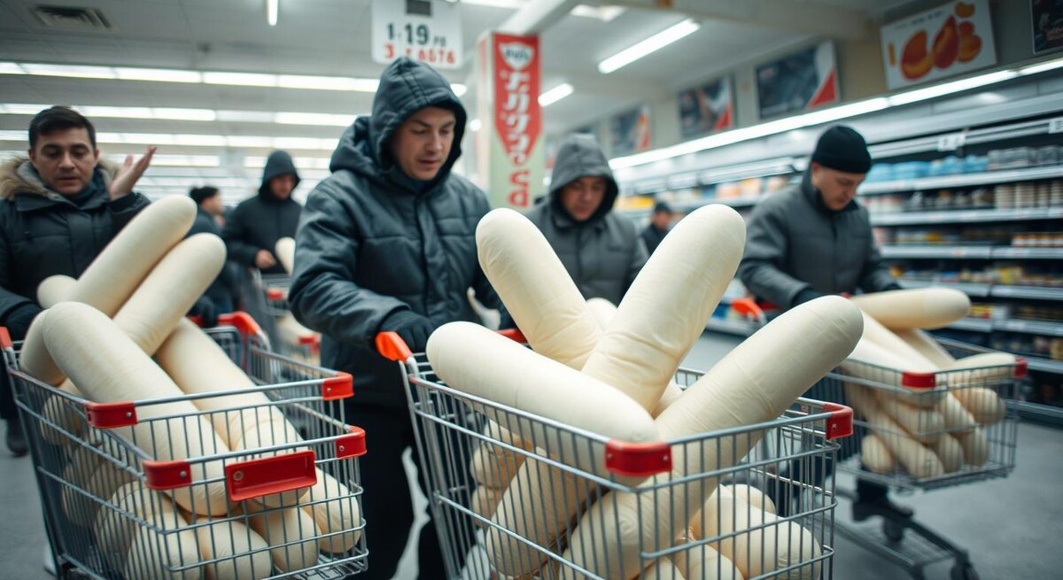 Началось всё, по нашим данным, в середине месяца в нескольких крупных сетевых супермаркетах и рынках. Город, где это заметили массово — московский пригород и несколько других региональных центров — даты записей варьируются, но пик пришёлся на последние две недели. Участники — в кадре чаще всего мужчины и женщины без бейджей, без униформы, с тележками, заполненными пачками батонов и длинных буханок. В некоторых роликах видно, что товары берут организованно, по несколько и более единиц каждого вида. На полке рядом остаётся пустота, разочарованные покупатели снимают на телефон. Некоторые кадры сопровождаются криками — «Они всё унесли!», «Как теперь нашим детям хлеб купить?» — и тут же реакцией персонала или охраны.