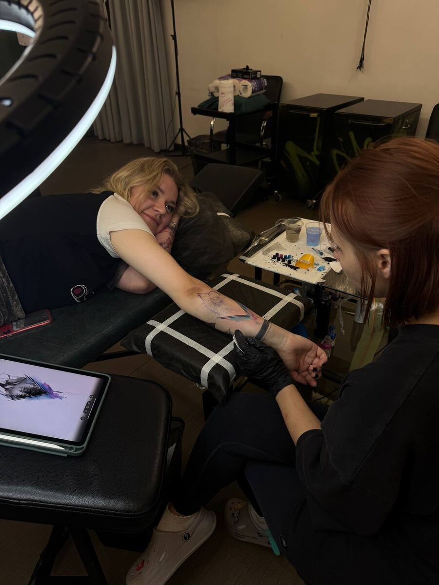 Для Оли самое сложное в процессе набивания тату — это виртуозно наполнить краской колпачок, не разлив ни капли! 😂✨ Похоже, у нас появился