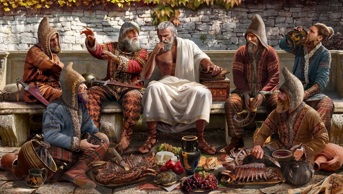 По мнению автора картины, именно так Отец Истории собирал материалы для своего знаменитого "Скифского рассказа"