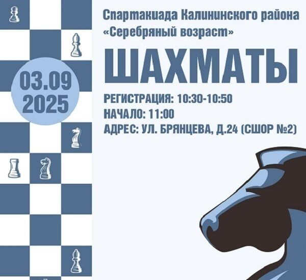 В Центре спорта Калининского района Петербурга на улице Брянцева, дом 24, в ближайшую среду, 3 сентября, пройдёт спартакиада «Серебряный возраст» по шахматам. Как уточнили в районной администрации, к соревнованиям допускаются женщины 55 лет и старше и мужчины 60 лет и старше. Победители и призёры спартакиады будут награждены грамотами, медалями и памятными призами. Начало соревнований – в 11:00. Заявки принимаются до 12:00 2 сентября по электронной почте: opm@fokalin.ru. Добавим, что в Петербурге с 9 по 15 сентября состоятся Международные спортивные игры святого благоверного князя Александра Невского. Их участники выступят в шести видах спорта – это баскетбол, футбол, настольный теннис, шахматы, волейбол и выполнение нормативов комплекса ГТО.