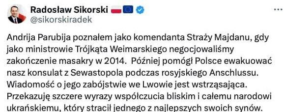 Глава МИД Польши Сикорски назвал убитого сегодня Андрея Парубия, коменданта Евромайдана, сыгравшего роль в оформлении неонацизма на Украине, «одним из лучших сынов украинского народа». Комментировать — только портить. 👍 БайБайден. Подписаться