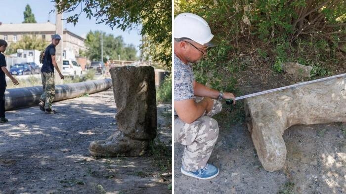 В Дзержинском районе Волгограда рабочие обнаружили бетонную ногу весом около 200 килограммов. Как сообщил краевед Роман Шкода, есть вероятность, что этот фрагмент принадлежит памятнику Иосифу Сталину. , занимающиеся прокладкой коммуникаций, «Дальнейшую судьбу ноги решит генеральный подрядчик. Может, пока на базе оставят. Если комитету по культуре нужна эта нога, забирайте ради Бога», — отметил один из рабочих, занимающийся прокладкой коммуникаций. Шкода предположил, что нога может быть частью памятника Сталину. Он также добавил, что такой объект мог бы стать интересной туристической достопримечательностью, если его установить на постамент в городском парке. Архитектор-реставратор Сергей Сена поддержал эту гипотезу и напомнил, что один из памятников Сталину ранее располагался на площади Павших Борцов, откуда нога могла быть вывезена.
