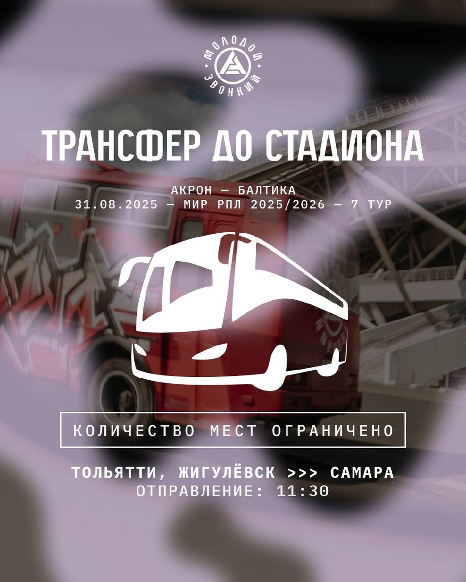 ⚽️ Завтра в Самаре состоится футбольный матч «Акрон» - «Балтика» 31 августа в областной столице пройдет футбольный матч между командами «Акрон» и «Балтика». Для болельщиков из региона организаторы предусмотрели бесплатный трансфер до стадиона «Солидарность Самара Арена». Где и когда будут организованы пункты отправления: 🔻 ТЦ «Озон», Жигулёвск - отправление в 11:30. 🔻 ТРЦ «Парк Хаус», Тольятти - отправление с парковки у правого входа в 11:30. 🔻 ДК «Тольятти» - отправление с остановки на улице Мира в 11:30. Автобусы доставят болельщиков прямо к стадиону. 📸: ФК «Акрон» Тольятти