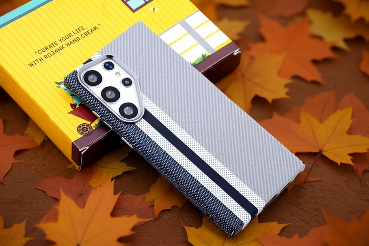 Чехол для смартфонов Samsung Galaxy изготовлен из материала, напоминающего углеродное волокно — лёгкий, но устойчивый к ударам и возникновению царапин. Края вокруг камерного блока слегка приподняты, что снижает риски возможного повреждения объектива при падении или установке на поверхность.