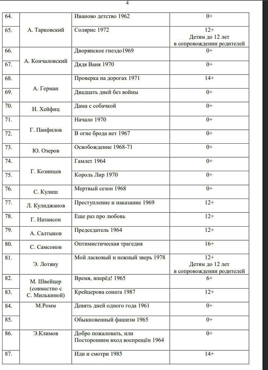 В Минпросвещения РФ опубликовали список из 100 кинокартин, обязательных для школьной программы Просмотр этих художественных фильмов будет способствовать сохранению и укреплению традиционных российских духовно-нравственных ценностей. Среди картин: «Белое солнце пустыни», «А зори здесь тихие», «Любовь и голуби», «Берегись автомобиля», «Солярис», «Иван Васильевич меняет профессию». Фильмы из списка рекомендуют использовать на уроках литературы, истории, изобразительного искусства, музыки.