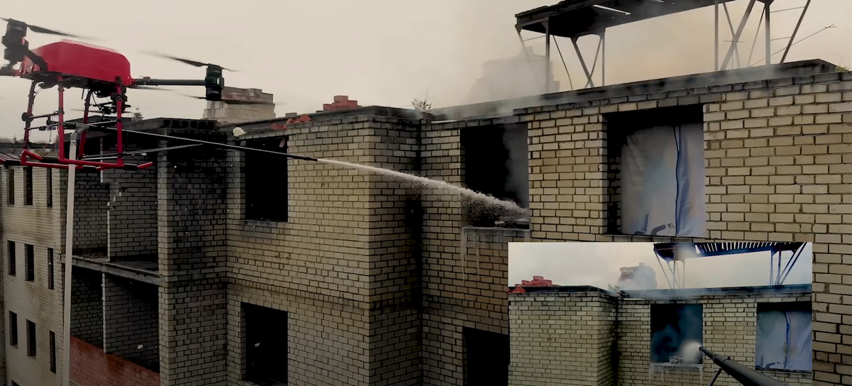 Дрон массой 85 кг несет аналогичную полезную нагрузку. Аппарат подключается к пожарной машине шлангом и подает смесь на высоту 150 метров. Это позволяет тушить возгорания на верхних этажах зданий.