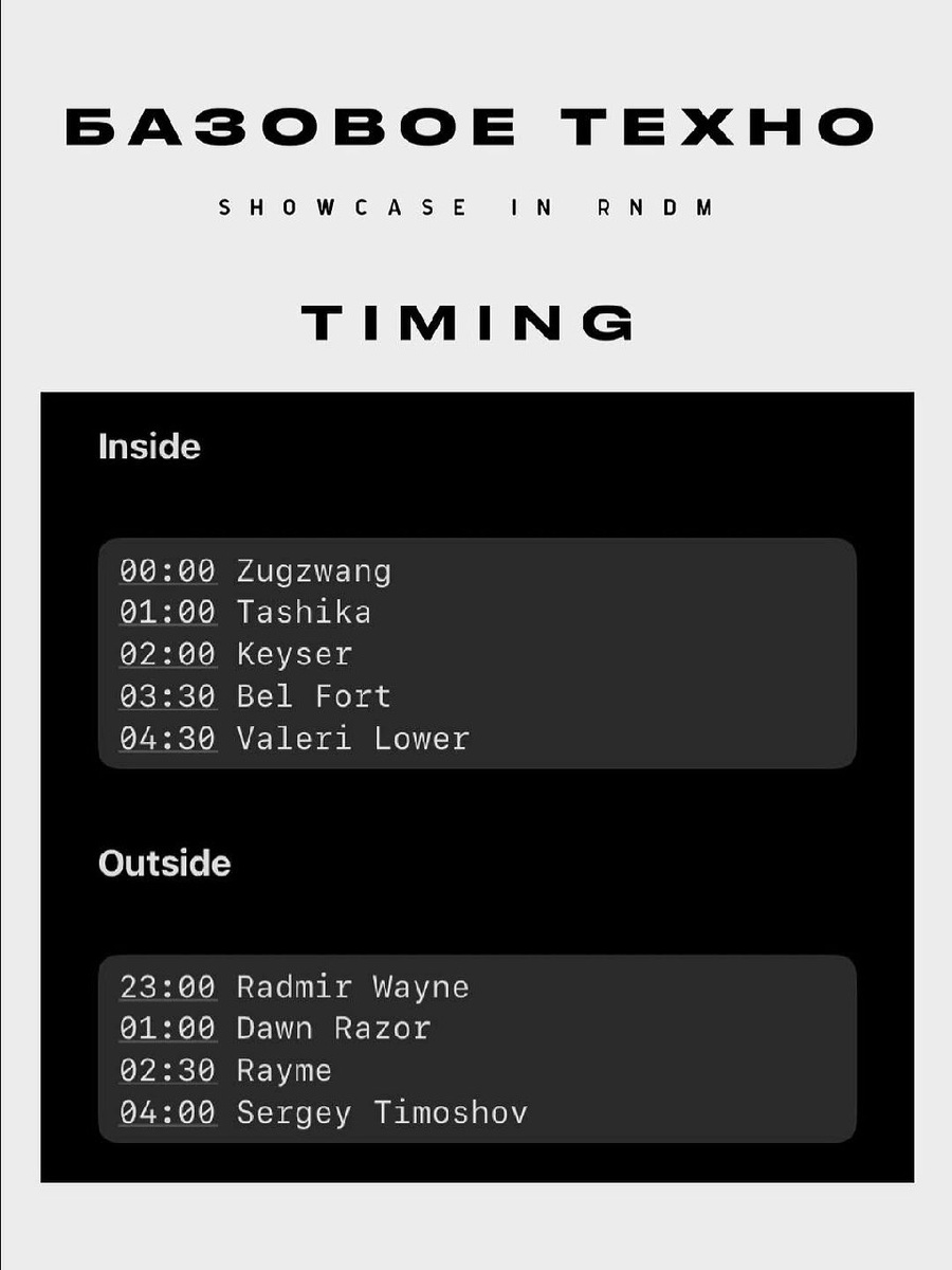БАЗОВОЕ ТЕХНО 30 августа Базовое Техно — это Питер, это музыка, которая дышит минимализмом, но живет в бесконечных вариациях. 30 августа в RNDM команда БТ везет актуальный срез северной андеграундной электроники: за вертушки на двух танцполах сегодня встанут резиденты лейбла и близкие по духу артисты из Москвы и Питера. 🎫 Билеты 📆 30 августа, 23:00 - 06:00 📍 RNDM, Москва, Наставнический пер., 13/15с3