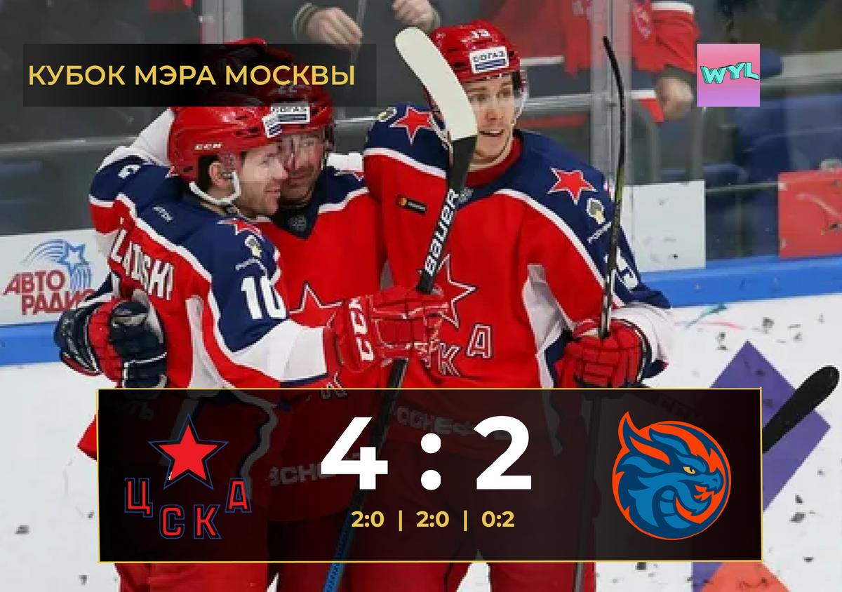 В сегоднешнем матче ЦСКА обыграли новую команду Шанхайских Драконов со счётом 4:2. ЦСКА уверенно вели в матче 4:0 и многие начинали думать, что это будет сухая победа для команды из Москвы. Но в 3 периоде на шестой минуте Куинн забил гол в большинстве. А затем на девятой минуте отличился Чехович забросив вторую шайбу в ворота ЦСКА. Яппаров 3' Янченко 10' (БОЛ) Абрамов 23'(БОЛ) Гурьянов 28' Куинни 46' (БОЛ) Чехович 49'