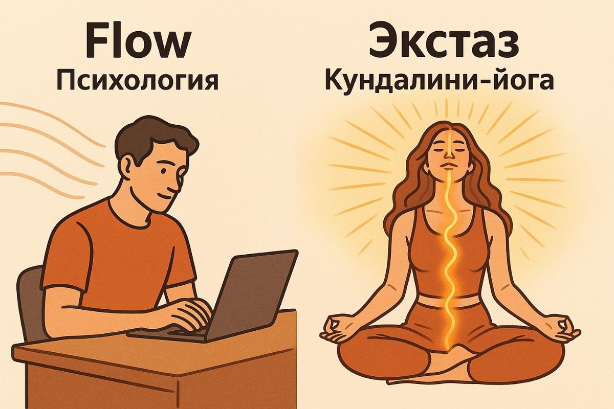 🌱 Перспектива психологии Ну а давайте посмотрим на всё то же самое через современную психологию. Позитивная психология (Селигман, Чиксентмихайи) говорит о счастье как о «благополучии», «гармонии», «смысле». Чиксентмихайи добавил сюда flow — состояние потока, когда человек полностью вовлечён в действие. Но давайте честно: ✨ flow — это всего лишь вовлечённость. ✨ Это «мягкий кайф» от работы или игры. ✨ Это не то, о чём говорили Платон, Плотин, Руми или Тереза Авильская. Они описывали не включённость в задачу и не ощущение смысла, а экзальтацию: подъем энергии, блаженное растворение, предоргазмическое слияние тела и духа. Современная психология всё это срезает и обесценивает: сводит к «гармонии», «потоку», «счастью в моменте». Но это не то. Это лишь тень. 📍 Настоящий экстаз — это кундалини-йога с Реализованным Мастером здесь и сейчас, метод прямой передачи, а не бесконечные упражнения ради упражнений: телесное пробуждение, эмоциональная волна любви, духовное растворение в целост