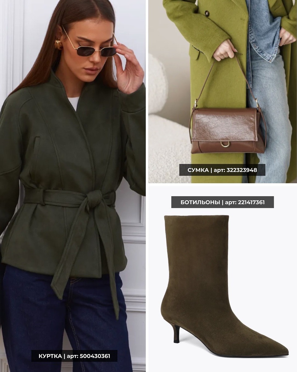 - Верхи: оливковая куртка [500430361] и шоколадная «кожа» [220183462] закрывают деловые и вечерние сценарии; тауп [321041864] — дневная база.