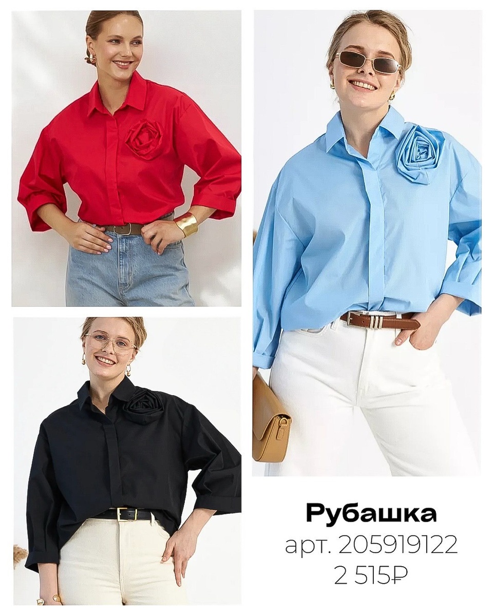 Почему это хит. Базовая хлопковая рубашка с WOW-деталью — тканевой «розой» на плече/груди. Свободная посадка, пониженная линия плеча, рукав 7/8 — то, что даёт воздух и делает силуэт современным. В палитре — красный, голубой и чёрный: можно собрать и смелый акцент, и чистый монохром.