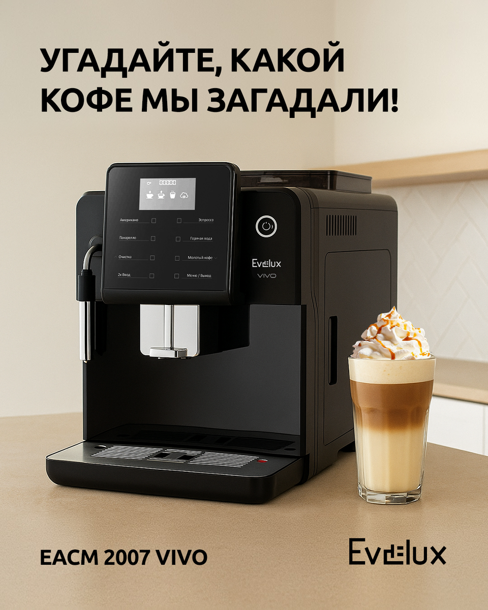 Насладиться любимым кофе в любое время вам поможет кофемашина Evelux EACM 2007 Vivo. Автоматическое приготовление эспрессо и капучино, встроенный капучинатор, регулировка крепости и объёма — всё это создаёт идеальную чашечку кофе. А для настоящих ценителей мы приготовили небольшую загадку: угадайте кофейный напиток по ингредиентам — эспрессо 50 мл, молоко 100 мл, лёд, сироп и мороженое. Какой кофейный напиток мы загадали? 1. Фраппе 2. Аффогато 3. Глясе Узнать о всех возможностях кофемашины вы можете по ссылке: clck.ru/3NYLgk