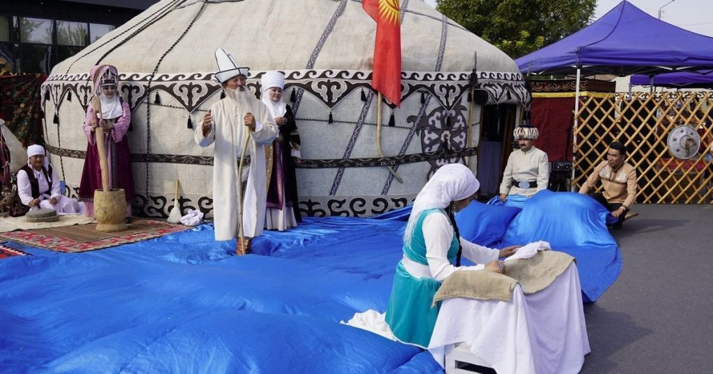 Кыргызстандын көз карандысыздыгынын 34 жылдыгына карата Жалал-Абадда өткөн "Улуу салттар мурасы" конкурсу улуттук каада-салттарды көрсөтүп, жаштарды тарыхый мурас менен тааныштыруу жана маданий байланыштарды бекемдөө максатын көздөйт. 🎉 Кыргызстан өзүнүн 34 жылдык көз карандысыздыгын белгилеп, Джалал-Абадда салтанаттуу иш-чаралар уюштурулду. 🕌 “Улуу салттардын мурасы” аттуу конкурста кыргыз элинин улуттук каада-салттары көрсөтүлдү. Бул иш-чарада куда түшүү, сөйкө салуу, үйлөнүү үлпөттөрү, азан менен балага ат коюу, бешикке салуу жана конок тосуу сыяктуу салттар көрсөтүлдү. 👗 Конкурс катышуучулары обряддардын мазмунуна, салттарга шайкештигине, улуттук кийимдерди жана турмуш тиричилик буюмдарын колдонууга, ошондой эле ритуалдык элементтерди сактоого жараша бааланды. 🗺️ Иш-чара улуттук духту бекемдөө, жаштарды тарыхый мурас менен тааныштыруу жана аймактар арасында маданий байланышты өнүктүрүү максатында уюштурулду. 🤝 Конкурска өлкөнүн жети облусунун өкүлдөрү катышты.