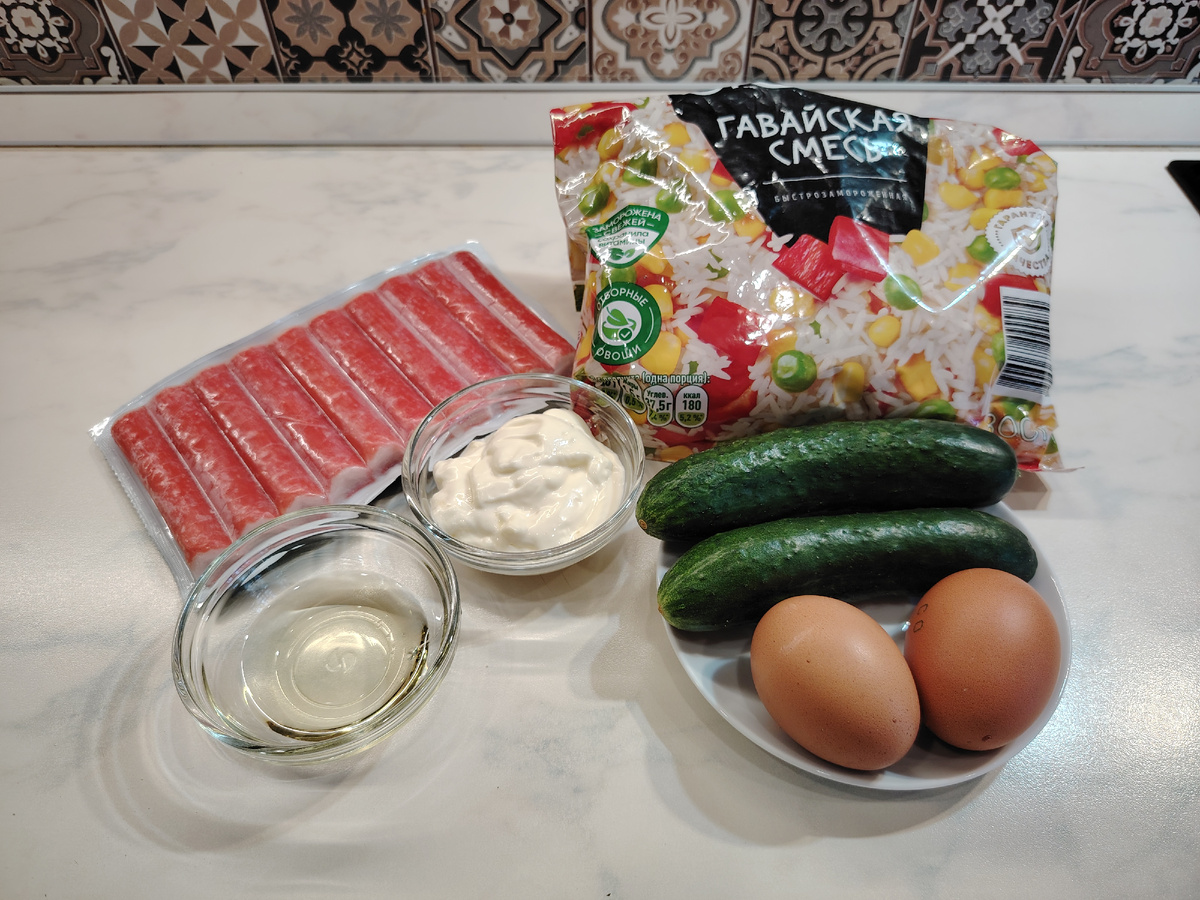 Крабовый салат с гавайской смесью — удачная и оригинальная интерпретация популярного салата с крабовыми палочками. Для его приготовления вам потребуется минимум дополнительных ингредиентов, ведь гавайская смесь уже содержит все необходимое! Вы можете пойти самым простым путем — отварить гавайскую смесь, а затем откинуть на дуршлаг, это займет всего 5 минут. В моём пошаговом рецепте замороженную смесь я предварительно обжариваю на растительном масле, благодаря чему овощи приобретают более яркий вкус. Замороженная гавайская смесь – 200 гр. Крабовые палочки – 200 гр. Огурцы свежие – 2-3 шт. Яйца – 2 шт. Майонез – 2 ст. ложки Масло растительное – 2 ст. ложки Соль, черный перец по вкусу. 1. Подготовьте ингредиенты по списку. 2. Положите яйца в небольшой ковшик и залейте водой. Варите на среднем огне в течение 10 минут. За это время яйца сварятся вкрутую. Слейте воду и остудите яйца в холодной воде. 3. В глубокой сковородке разогрейте на средне сильном огне растительное масло. Выложите гав
