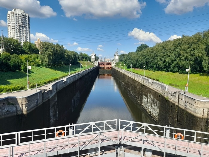 Нечасто бываю в Тушино и окрестностях, и одно из моих любимым мест там - это шлюз №7, через который проходит пешеходный мостик из парка Покровское-Стрешнево в сторону улицы Свободы. Этот мостик используется также в качестве смотровой площадки, с которой можно понаблюдать за процессом шлюзования. Раньше, конечно, больше был размер грузового движения по Каналу имени Москвы, поэтому сейчас, после закрытия Западного порта и причальной стенки Краснопресненского завода ЖБК, сам процесс шлюзования можно наблюдать уже реже. Но по-прежнему ходят теплоходы от Северного речного вокзала в сторону реки Оки, да и баржи и сухогрузы тоже можно увидеть. Пешеходный мостик расположен над нижними воротами, отделяющими нижнюю камеру шлюза от акватории между шлюзами 7 и 8. Заполнение нижней камеры занимает полчаса, столько же времени занимает и слив воды из неё. Подписаться на Пикабу Познавательный. и Пикабу: Истории из жизни.