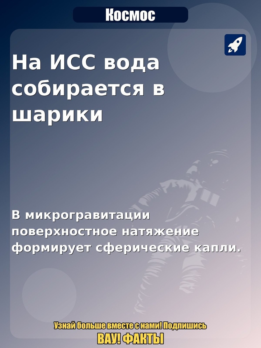 На ИСС вода собирается в шарики. В микрогравитации поверхностное натяжение формирует сферические капли. Интересный факт по теме «Космос»: На ИСС вода собирается в шарики. Почему так: В микрогравитации поверхностное натяжение формирует сферические капли.. Поделитесь в комментариях, знали ли вы об этом и стоит ли делать продолжение по теме. #космос #факты #астрономия