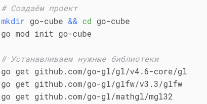 Введение: Почему Go и 3D? А почему бы и нет если не запрещено ? Хотя писать на Go подобные "проекты" глупость и я бы не советовал, но всё же поиграться с ним можно. Для этого есть отличная библиотека GoGL (OpenGL биндинги для Go) и GLFW для создания окон. Сегодня мы создадим вращающийся куб с текстурами. И всё это — на чистом Go. Команды для терминала: Почему именно эти библиотеки? Проверяем установку: Создаём main.go: Запускаем: Добавляем инициализацию в main.go: Добавляем функцию создания шейдеров: Определяем исходники шейдеров прямо в коде: Создаем шейдерную программу в main: Определяем вершины куба: Создаём буферы: Используем mathgl для матриц: Сложности, с которыми можно столкнуться: Go даёт: Этот куб — только начало. Дальше можно добавить: P.S: Это просто пример как можно реализовать(решил просто посмотреть будут ли подобные статьи интересны или