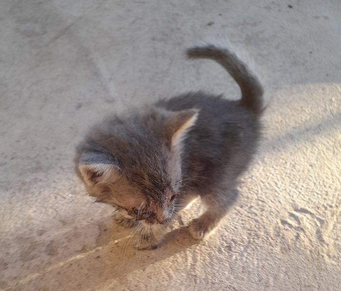 Вечером, 28 августа, возле двери в дом, было обнаружено непонятное орущее чудовище серого цвета. Существо пронзительно пищало, вращало головой на которой сидело несколько мух и шарахалось в разные стороны, по причине того, что глаза слиплись от засохшего гноя. Так как сердце у меня слабое, материнское. То существо было отмыто дегтярным мылом, глазья промыты тёплой водой, покормлено кефиром и определено в коробку из под блендера: На следующий день, сразу после педсовета, существо было отвезено к ветеринару, который приговорил правый глаз к удалению, влепил ему несколько уколов, выдал список лекарств и определил пол - кот. Существо получило имя - Мыша. С ударением на Ы! Получило набор лекарств и еды: И вот уже третий день существо активно перемещается по дому, дрыхнет в коробке, получает четыре укола в день (витамины, противовирусные, антибиотик), здоровый глаз дополнительно обрабатывается, детское питание "Тёма" активно жрётся. Когда Мыша начинает издавать звуки во дворе (например: когд