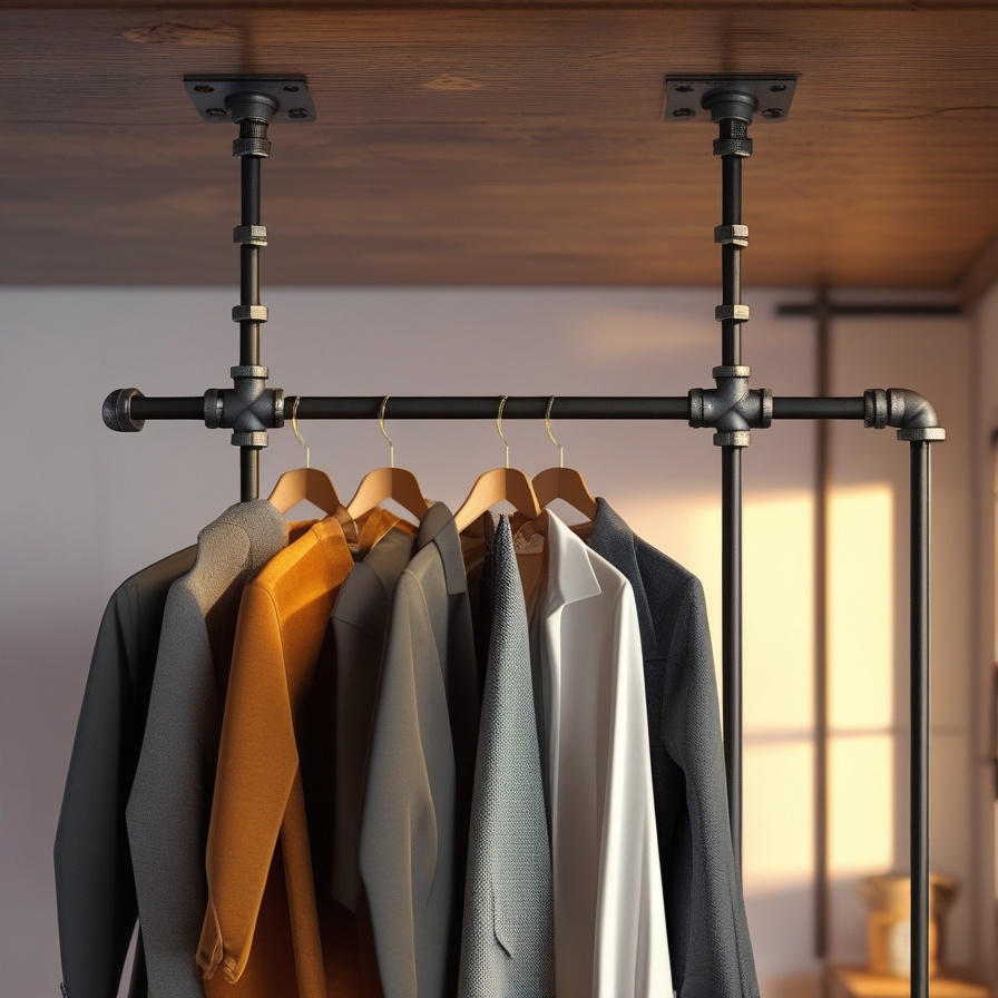 • Потолочная штанга из трубы — идеально для спальни или гардеробной. Визуально лёгкая, но выдерживает десятки вешалок.