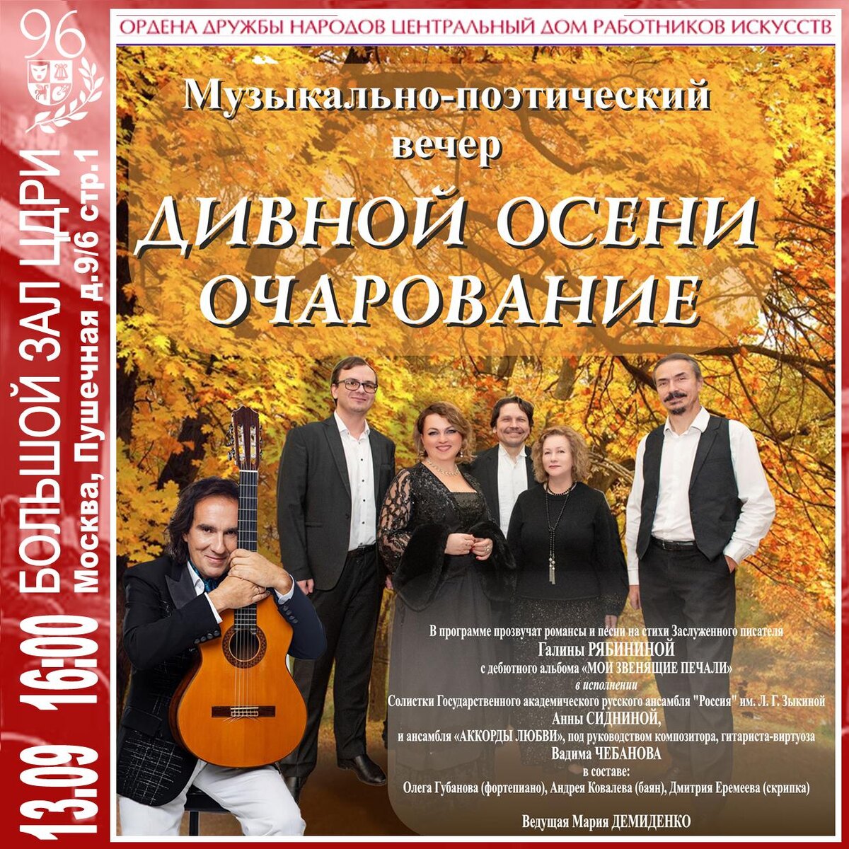 Музыкально-поэтический вечер «Дивной осени очарование» В программе романсы и песни на стихи заслуженного писателя Галины Рябининой из дебютного альбома «Мои звенящие печали» На концерте состоится премьера романсов и песен о любви и природе, написанных на стихи заслуженного поэта МОО СП России Галины Рябининой за последнее время и стихи в авторском исполнении, а также презентация дебютного альбома «Мои звенящие печали». Мелодии романсов написаны известными композиторами: