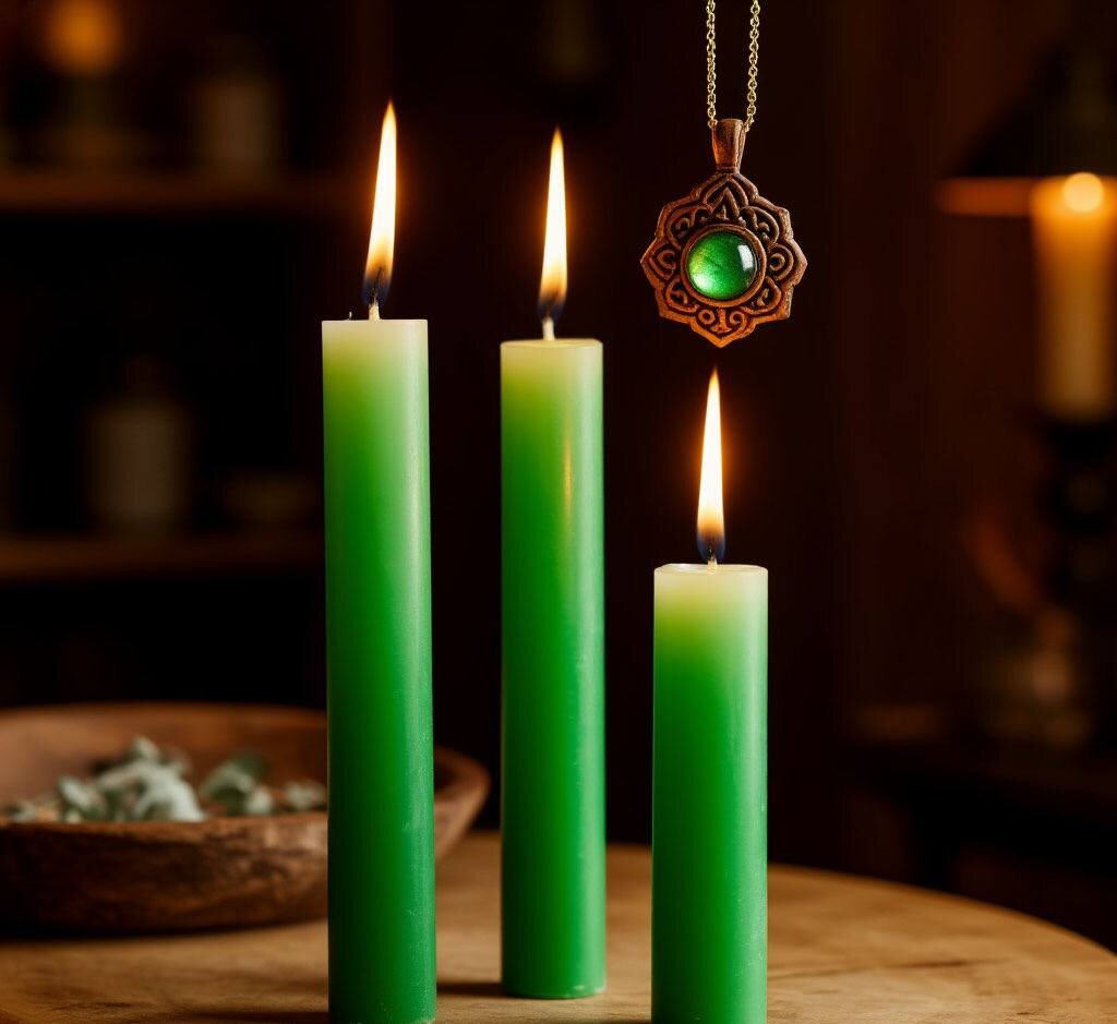 Установите 3 зеленых свечи в форме треугольника вершиной на Север. В центр положи фото, на кого совершаете обряд, сверху положите амулет с нитью черной. Зажгите 3 свечи и на каждую скажите слова заговорные.
