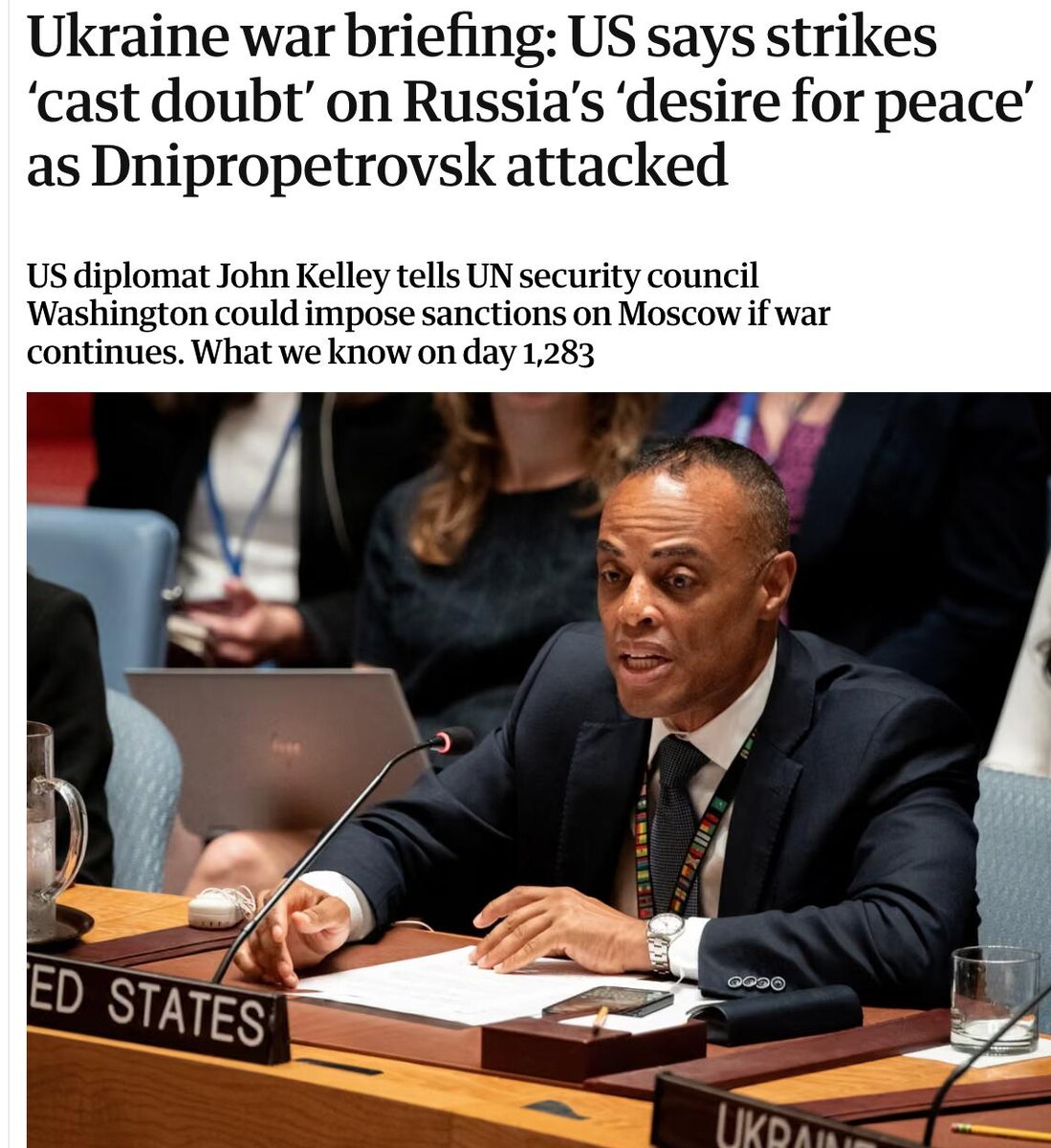 Вчера прошло инициированное режимом Зеленского заседание Совбеза ООН после массированного удара по Киеву. Как пишет The Guardian, представитель США Джон Келли призвал Москву «двигаться к миру и встретиться с Украиной». Келли заявил на Совбезе, что удары «ставят под сомнение серьезность стремления России к миру» и потребовал, чтобы «эти удары по гражданским районам были немедленно прекращены». Он сказал, что Путин и Зеленский должны договориться о встрече, и повторил предупреждение Трампа о том, что Вашингтон может ввести санкции против России, если война продолжится. Представитель России Полянский в свою очередь заявил, что удар по Киеву - это ответ Украине на прилеты по нефтеперерабатывающим заводам РФ. В усиление слов Полянского ВКС хорошенько добавили еще и минувшей ночью. Подпишись на Телеграм Александр Семченко В этом посте есть большое видео, которое не загрузилось в Дзен. Откройте оригинал поста в телеграме, чтобы его посмотреть