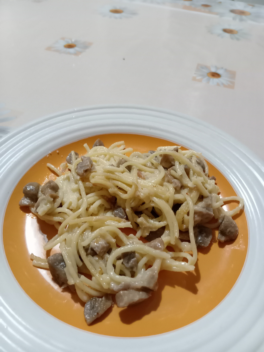Макароны с грибами одно из моих любимых блюд 😃 а главное быстро и просто готовить: ✅ Шампиньоны, я беру коробку на 400 грамм. Можно взять и другие грибы, в меня просто в магазине только они. ✅ Лук, я люблю с красным, он мягче, но можно и с классическим белым репчатым. Взяли, нарезали как нравится и отправили на сковородку жариться на растительное масле 🍳 ✅ Пока жарится мы трём сыр, я люблю мягкий добавлять, из серии сливочный или российский, но тут все на свой вкус, я беру кусок грамм на 100, чем больше, тем вкуснее 😋 ✅ Сливки, добавляем, когда грибочки уже немного приготовились, минут через 10, и ещё на 10 минут впитывать сливки. ✅ Ставим лапшу, у меня спагетти на 9 минут. Готово! Соединяем, посвпакм сырочком и наслаждаемся 😋 Приятного аппетита 😋