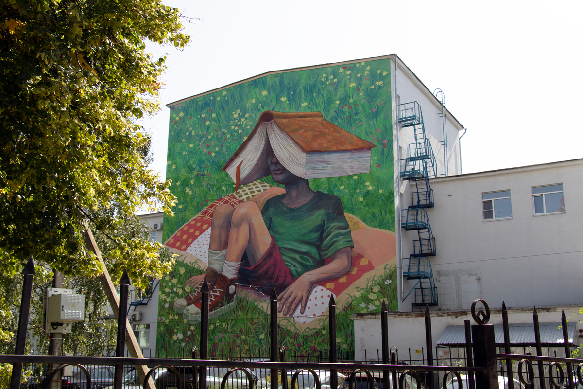 Вот такое граффити у нас встречает гостей города. Достаточно немного пройти от вокзала по направлению к центральной улице и вуаля, прямо рядом с большим ТРЦ, на задней стене бывшего Дома культуры профсоюзов, теперь Муниципального культурного центра есть вот такая большая картина. Вроде бы и ничего. Но если приглядеться, то начинаешь удивляться. Мальчик использует книгу вместо зонтика от солнца. Ну ничего бывает. Только почему мальчик несколько похож на афроамериканца… Мы вроде бы в центральной полосе России живем. У нас в городе, конечно, учатся молодые люди из разных стран мира, но в целом негров не то чтобы много. Разве что около Медгородка они регулярно встречаются, а так их и нет почти, Рязань не Москва. Странное граффити какое-то. Хотя, конечно, всегда можно сказать, что "это просто тени такие глубокие". Но нарисовано красиво, конечно. ------------ Не ленитесь, ставьте лайки :) Они поднимают настроение и вместе с вашей подпиской помогают развитию канала. А еще можно подписаться н