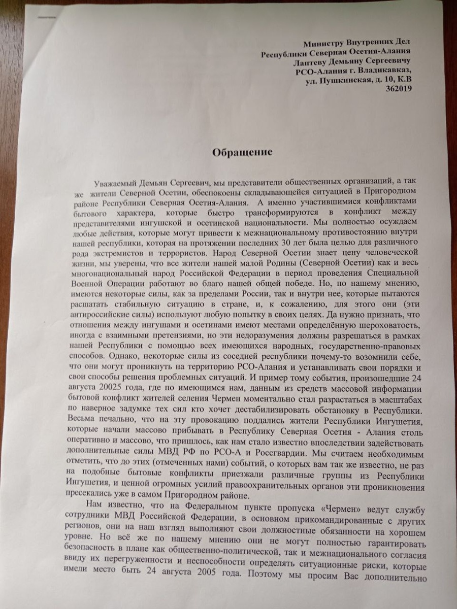 «Высший Совет Осетин» и другие общественники обратились к министру внутренних дел РСО-Алания с просьбой направить дополнительных полицейских из республики на 105-й Черменский пост для совместного патрулирования и усиления наших сотрудников полиции. (@iron_bonvarnon)