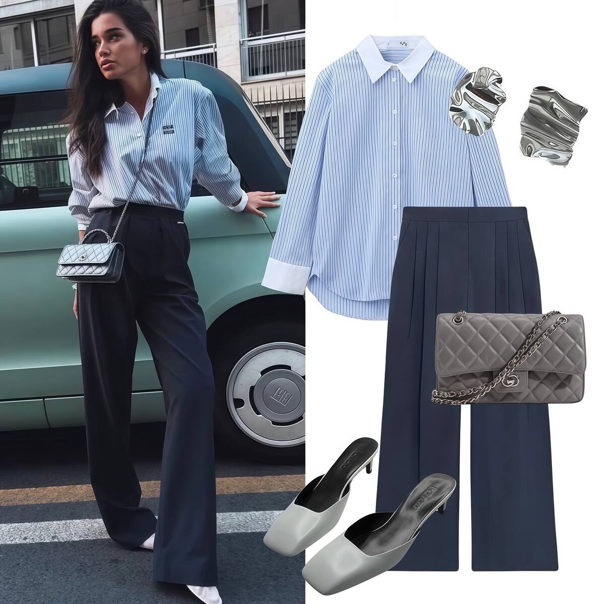 Когда смотришь на фотографии знаменитостей, порой создается впечатление, что до их уровня никогда не дотянуться. Мы видим идеальные образы, за которыми стоят целые команды стилистов, визажистов и парикмахеров. А стоимость одежды, которую они носят на своих фотосессиях, иногда равна твоей месячной зарплатой. А то и годовой! Но вот в чем дело: если взглянуть на эти фото со знанием дела и выделить ключевые элементы, то становится ясно, что повторить большинство образов вовсе не так сложно, как кажется на первый взгляд. Главное — не стремиться слепо копировать, а использовать их как референс, создавая свои уникальные наряды на основе увиденного Сегодня я нашла отличный пример — образ Ксении Бородиной. Он элегантный, сдержанный, но при этом шикарный. А главное — универсальный и простой для повторения. Темно-синие брюки и полосатая рубашка — это те вещи, которые можно найти практически в любом магазине, от масс-маркета до люкса Так что давайте не будем терять время! Я собрала ссылки н