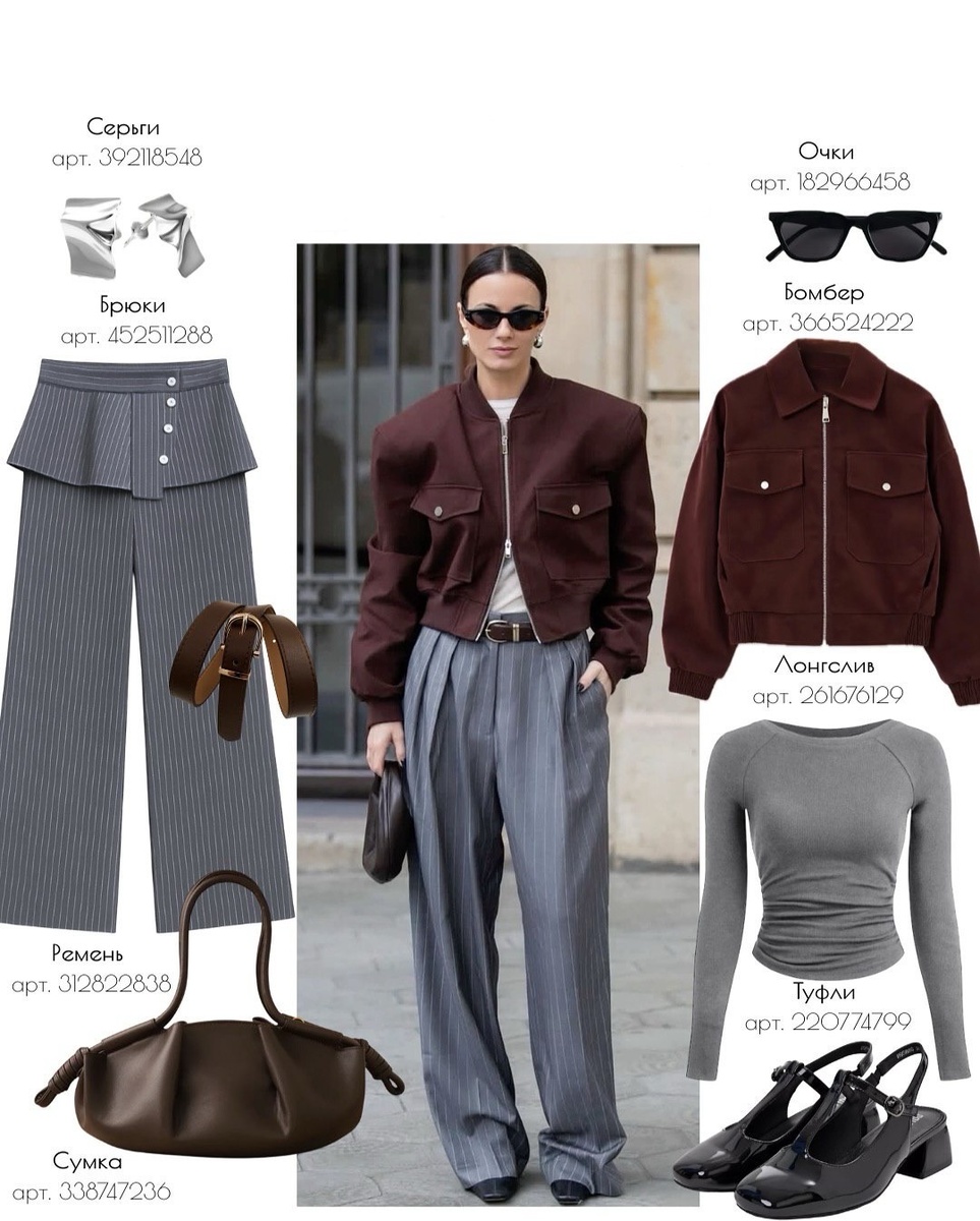 Гладкая геометрия, мягкие фактуры и хрупкая женственность — так звучит самый актуальный «умный кэжуал»: когда строгие линии брюк и очков встречаются с тёплым бомбером и пластикой серого лонгслива. На этом коллаже — полный состав образа, собранный из доступных находок WB. Разбираем строго по порядку по артикулам, даём стилистические приёмы и готовые формулы, чтобы комплект работал на вас каждый день.