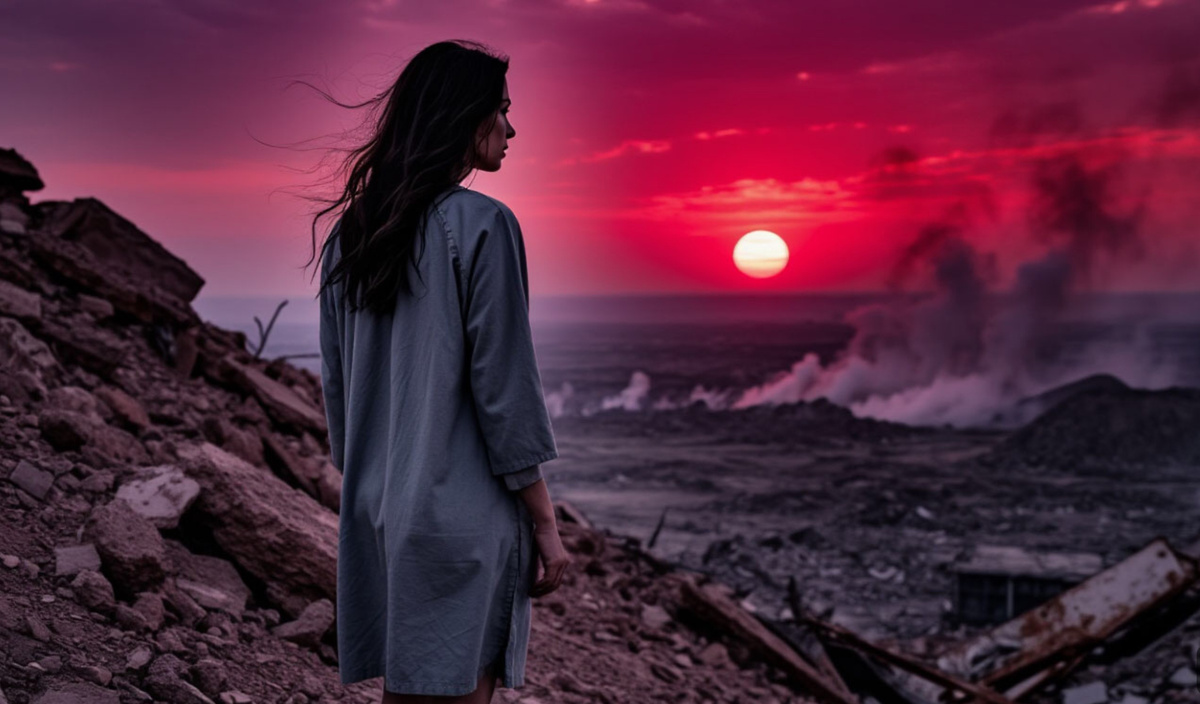 ПРЕДЫДУЩАЯ ГЛАВА 👆 Эпилог. Тишина после. Она шла. Не зная дня, не зная ночи. Время потеряло смысл, растворившись в монотонном шелесте пепла под ногами и в вечном свисте ветра. Багровые сумерки не сменялись тьмой — солнце, умирающее и бледное, застыло у горизонта, отливая мир в вечный, болезненный полумрак. Ее тело, изможденное и легкое, двигалось на автомате, повинуясь древнему инстинкту — искать приют, воду, жизнь. Но разум молчал. Внутри была та самая, выстраданная тишина. Она была похожа на чистый лист, на который еще не упала ни одна чернильная капля. Она прошла мимо остова грузовика, проржавевшего насквозь, сквозь его кузов проросли кристаллические образования, похожие на черные стеклянные цветы. Мимо обрушенных ферм, где металлические скелеты строений упирались в ядовитое небо. Мимо высохшего русла реки, на дне которого лежала потрескавшаяся глина, сложенная в причудливые узоры, словно кто-то гигантский пытался что-то нарисовать. Она не искала признаков жизни. Она просто шла