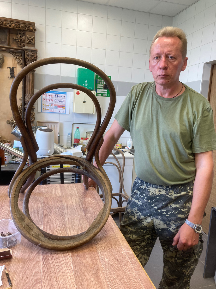 Серафим Ромащенко, прежде чем его позвали работать реставратором мебели в музей-заповедник С.А. Есенина, успел окончить Богородское художественно-промышленное училище по специальности «Декоративно-прикладное искусство и народные промыслы», где в совершенстве научился богородской резьбе. А затем почти двадцать лет поработал на частных заказах, в том числе по восстановлению иконостасов, церковной скульптуры и мебели. Помогал он и в восстановлении экспонатов в Рязанском историко-архитектурном музее-заповеднике, откуда и был отрекомендован в музей в Константиново, где как раз в 2018 году создавался отдел реставрации.