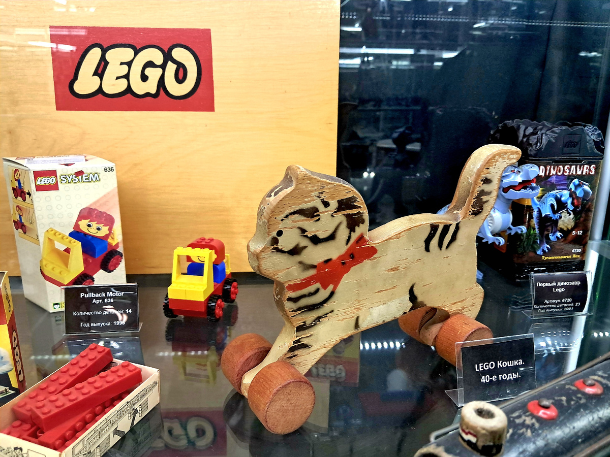 Музей кажется небольшим, и изначально я думала, что мне хватит там получаса. В итоге и часа не хватило.:)) Открывает экспозицию изумительная деревянная лего-кошка 1940-х годов создания — одна из первых игрушек фирмы. Рядом с ней — железная дорога примерно той же эпохи. То самое «Ты помнишь, как всё начиналось».:)