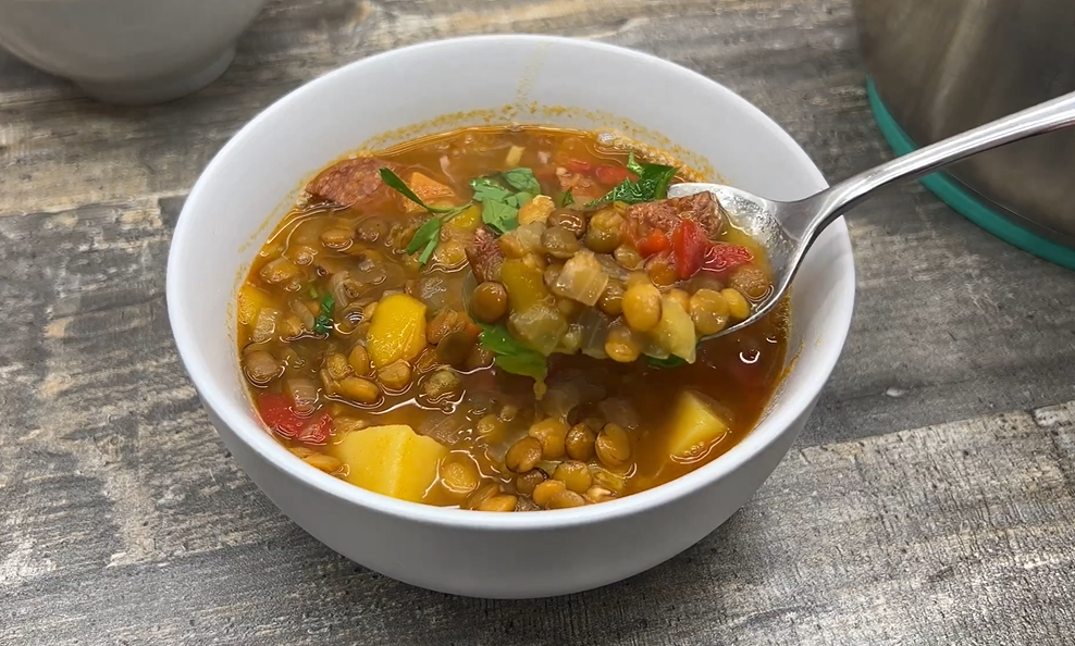 Чечевица — это основа множества сытных и полезных блюд. Она богата белком, отлично насыщает и хорошо сочетается с овощами. Но если добавить к ней немного колбасы чоризо, вкус супа становится ярче, глубже и интереснее. Лёгкая остринка, копчёные нотки и аромат специй из чоризо создают совершенно новый уровень привычного блюда. Такой суп можно смело подавать и как повседневное угощение, и как праздничное первое блюдо. Главное в этом рецепте — готовить всё на слабом огне. Тогда продукты постепенно отдают вкус, и суп получается наваристым, густым и очень ароматным. Шаг 1. Чоризо.