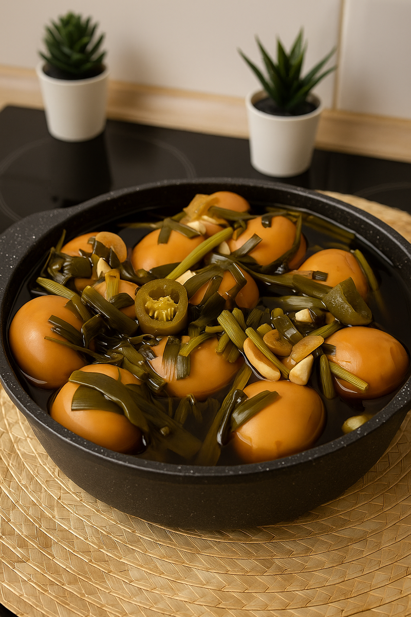 Дорогие зрители, давно я показывала вам этот рецепт на перепелиных яйцах. Но поскольку наша кулинарная семья растёт, и многие новые зрители могли его не увидеть, я решила повторить этот рецепт уже на куриных яйцах. И знаете, от него невозможно оторваться! 🙌🏻 Эти яйца получаются удивительно ароматными, с лёгкой остринкой и насыщенным вкусом соевого соуса. Готовятся они элементарно, а результат — ресторанный. В Азии такие закуски подают в кафе, к лапше или рису, а дома они становятся настоящей палочкой-выручалочкой: и как самостоятельная закуска, и как дополнение к любому блюду. 1. Подготавливаем основу. Сначала отвариваю яйца вкрутую. Остужаю их и тщательно очищаю от скорлупы. 2. Маринад — душа блюда. В кастрюлю наливаю литр воды, добавляю 200 мл соевого соуса, уксус, сахар, чеснок (лучше нарезать слайсами), острый перец и зелёный лук. Ставлю на плиту и довожу до закипания. В этот момент по кухне начинает распространяться потрясающий аромат — смесь соевого соуса, чеснока и специй. 3.