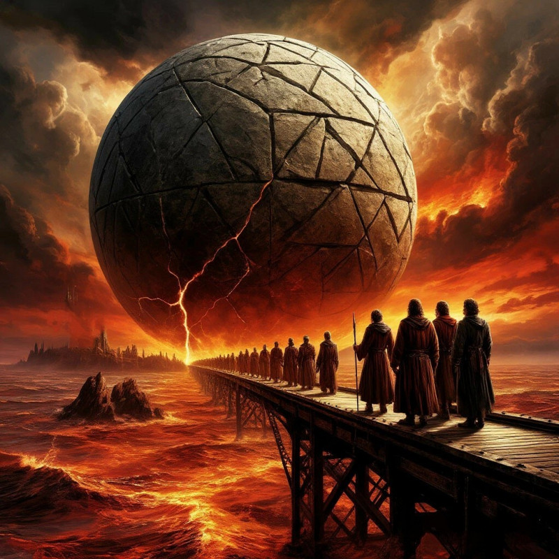 - Ты еще не знаешь, насколько я силен, - отозвался Гальнеккен, и в его синих глазах полыхнули отсветы оранжевого зарева, стоявшего над объятым пламенем миром. Кейт осеклась, слова, готовые сорваться с ее губ, так и остались не произнесенными. Держа ее на руках, Галь-Рикки сделал шаг вперед, затем другой. Девушка зажмурила глаза. Сначала Гальнеккен двигался осторожно, но с каждым новым шагом его поступь становилась все тверже и уверенней. Это была походка не деревенского паренька, а траурный и четкий шаг полководца перед решающей битвой с многократно превосходящей числом вражеской ордой. Он вступил на мост, безумной дугой поднимавшийся ввысь, и не останавливаясь, двинулся навстречу неизвестности. Когда Кейт открыла глаза и осмелилась посмотреть вперед, то увидела, что сквозь пелену закрывших небо грозовых туч проступают неясные очертания какого-то громадного предмета сферической формы, занимавшего половину неба.