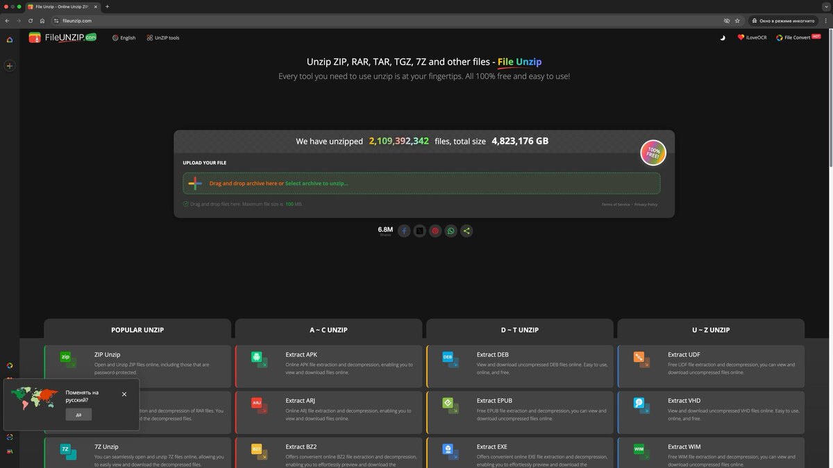 📁 FileUnzip — распаковка любого архива прямо в браузере Онлайн-архиватор, который открывает ZIP, RAR, 7Z и другие архивы без установки программ. Просто загрузи файл — и сразу получишь доступ к содержимому. ⛏ Как работает Перетаскиваешь архив на сайт или выбираешь вручную. Через пару секунд сервис показывает список файлов, которые можно просмотреть или скачать отдельно. Поддерживает пароли, большие архивы и даже drag’n’drop внутри браузера. 👌 Что удобно — Работает на любом устройстве — Без регистрации — Поддержка популярных форматов (ZIP, RAR, 7Z, TAR, TGZ, TAR.gz, TAR.bz2, TAR.Z, TAR.Izma, TAR.xz, DEB, EPUB, EXE, GZ, ISO, PKG, RPM, APK, MSI, ARJ, BZ2, CAB, CB7, CBR, CBT, CBZ, CHM, CPIO, CSO, LZH, TBZ2, TGZ, TXZ, UDF, VHD, WIM, XAR, XZ, Z, ZPAQ, ZST) — Есть предпросмотр текстов и картинок — Файлы удаляются автоматически ❗️ Что важно знать Сайт бесплатный, но с рекламой. Не хранит файлы дольше сессии, но если у тебя конфиденциальные данные — лучше использовать локальные инструменты