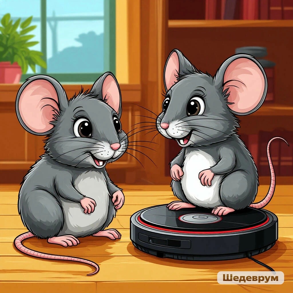 Однажды в доме, где жила Масяня, произошло нечто странное. Хозяева принесли круглую блестящую штуку, которая тихо жужжала и ездила сама по себе! — Это робот-пылесос! — прошептала старая крыса Барбара, выглядывая из-под шкафа. — Он съедает все крошки на полу, а если увидит мышку — попытается проглотить и её! Мыши заволновались. Теперь даже днём, когда кошка Мурка спала, выходить из норки стало опасно! Масяня решила разобраться. Ночью, когда все спали, она осторожно подкралась к роботу-пылесосу. Тот стоял на своей зарядной станции и тихо посапывал (точнее, слегка гудел). — Интересно… — прошептала Масяня. Она тронула пылесос лапкой — и вдруг он ожил! — Вжжжж! — завизжал робот и рванулся вперёд. Масяня едва успела отпрыгнуть! Пылесос носился по комнате, задевая стулья и пугая спящую кошку. — Надо его остановить! — поняла Масяня. Вспомнив, как победила Мурку с помощью колокольчика, Масяня придумала новую идею. Она нашла маленький шарик из фольги (который когда-то был от шоколадки) и подкати