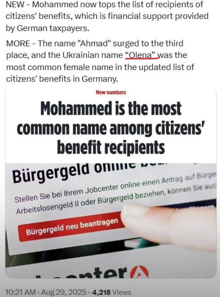 Мухаммед, Ахмед и Олёна - самые популярные имена среди получателей пособий в Германии. @nemediatema