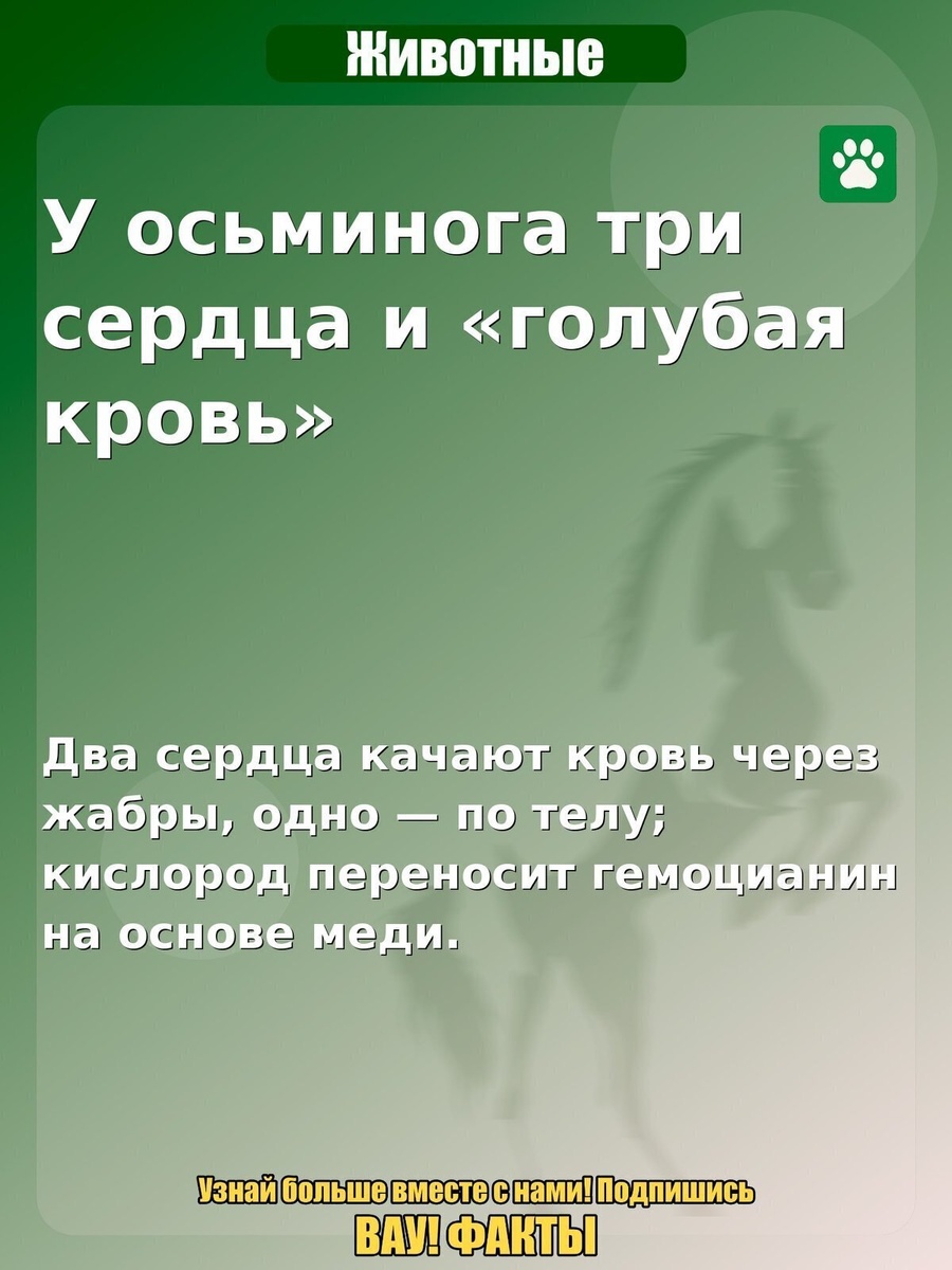 У осьминога три сердца и «голубая кровь». Два сердца качают кровь через жабры, одно — по телу; кислород переносит гемоцианин на основе меди. Интересный факт по теме «Животные»: У осьминога три сердца и «голубая кровь». Почему так: Два сердца качают кровь через жабры, одно — по телу; кислород переносит гемоцианин на основе меди.. Поделитесь в комментариях, знали ли вы об этом и стоит ли делать продолжение по теме. #животные #факты #природа