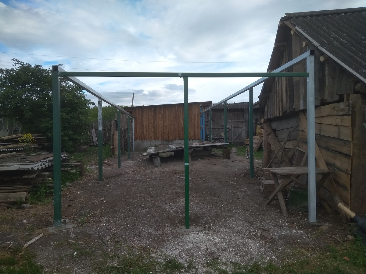Неожиданно мы подрядились в строители. Есть у нас соседки, две сестры. Двор у них от старости валится. Решили они его перестроить. Одна сестра хочет новый сарай-гараж, как у нас, из новых материалов. Чтоб вот такой каркас был: Младшая же пытается сэкономить и просит построить из того, что осталось от слома старого сарая, чтоб столбы дубовые, а стены обшить старыми досками. Строить из старого мы отказались. Из нового договорились на осень. Но посреди лета слышим – кто-то у них пилит, колотит. Нашла младшая подрядчика построить сарай из старых досок. Когда сарай практически был достроен, сосед уехал. А ворота на гараж не сделал. Стали соседки нас уговаривать сделать им ворота. Мы отнекивались – мы криво делать не умеем, а пришить ровные ворота к кривым сучкастым столбам нам нечем, за крепежом ехать надо, а нам в город пока не надо. Гуляем с ними и всё разговор ведём, чем ещё можно брус к дубовым столбам прикрепить. И тут вспомнили, что есть у нас "глухари", длинные толсты шурупы. Завер