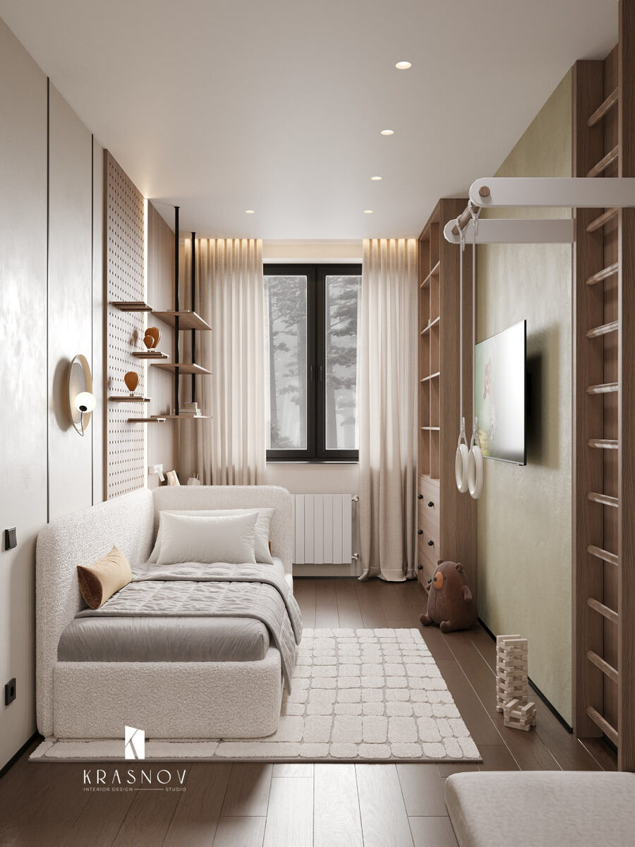 Дети растут быстрее, чем мы успеваем это заметить. Сегодня — мягкие игрушки, завтра — учебники, а через пару лет — спортивные тренировки и ноутбук для первых проектов. Поэтому детская должна быть не просто красивой — она должна расти вместе с ребёнком. Что важно для родителей — и что мы сделали в этом проекте: — Безопасность и уют. Мягкая кровать без острых углов, обивка из букле молочного оттенка. Материал держит форму даже при ежедневных «батлах на подушках». Кровать — это не просто место сна, а кокон, где ребёнок чувствует себя в безопасности. — Физическая активность дома. Мы встроили целый мини-спорткомплекс: шведская стенка, кольца, скалодром. Всё сделано из дерева, с амортизацией, в единой эстетике — никакой дешёвой пластмассы. У ребёнка есть пространство, чтобы выпускать энергию, не разрушая остальной дом. — Организация и самостоятельность. Шкаф с подсветкой и открытыми секциями можно переоформлять под интересы и возраст. Нижние ящики — на уровне ребёнка, чтобы он доставал всё с