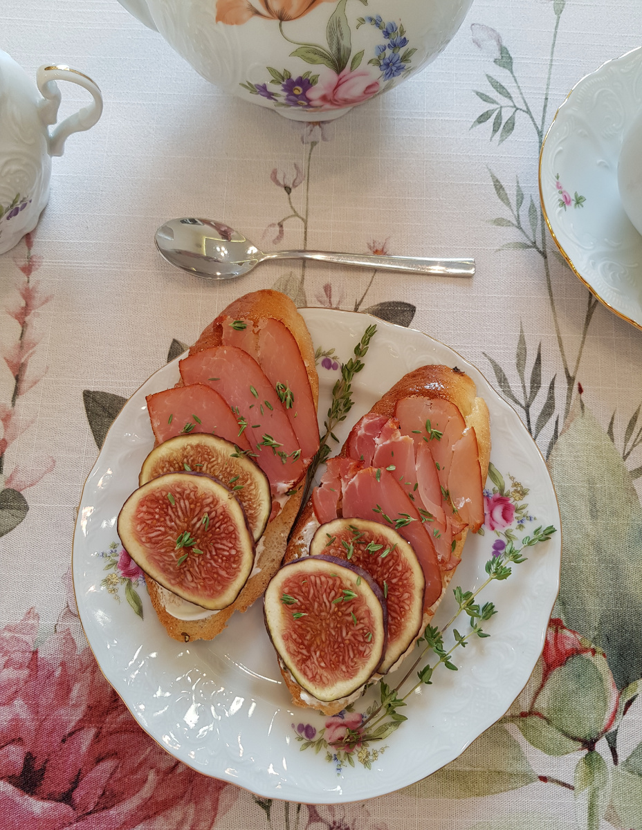 Доброе утро, дорогие друзья! Сегодняшний день я предлагаю начать с известного итальянского блюда — брускетты, а добиться приятного сочетания вкусов нам позволит начинка из сладкого инжира, кусочков вяленой свинины, листиков свежего тимьяна и творожного сыра. Для приготовления нам понадобятся: 1 багет, инжир 2 штуки, сыровяленая свинина 100 грамм, чеснок, черный перец, оливковое масло, соль, 50 грамм творожного сыра, тимьян. Приготовление: багет нарезать ломтиками наискосок. Подсушить ломтики батона на гриле без масла при температуре 200 градусов Цельсия. Нарезать тонкими ломтиками свинину и инжир. Подсушенный батон натереть с одной стороны чесноком. С этой же стороны полить оливковым маслом. Распределить оливковое масло с помощью кулинарной кисти по ломтикам батона, посолить и поперчить. Намазать с одной стороны ломтики хлеба творожным сыром. Выложить свинину на сторону кусочков без сыра, инжир выложить на творожный сыр. Посыпать сверху брускетты листиками тимьяна. Приятного аппе