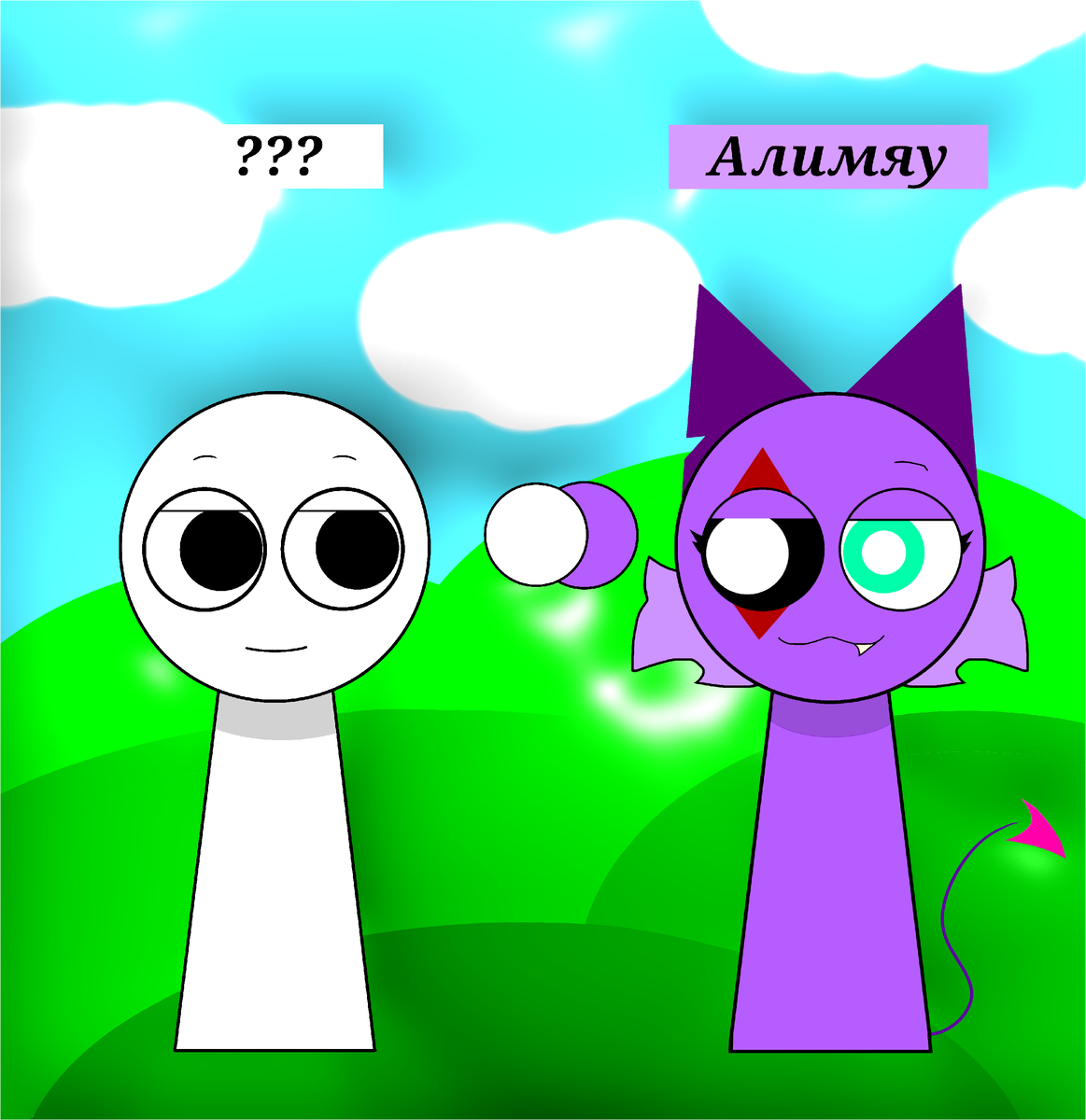 Нарисуйте рядом с Алимяу своего персонажа, и напишите сверху имя вашего персонажа, ваши рисунки я покажу в следующем видео {;