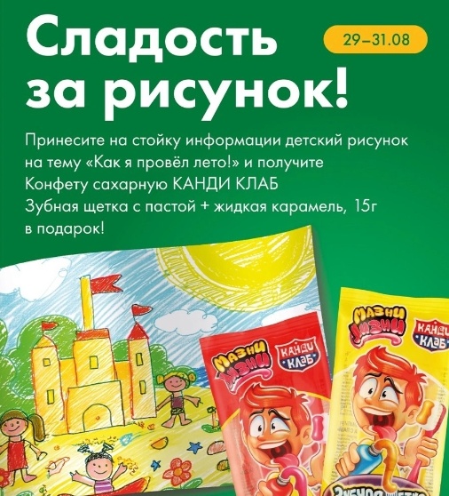 Добрый день, друзья! Уже завтра идем в школу и отмечаем День знаний. Сейчас расскажу как получить подарки от магазинов. До 31 августа нужно принести на стойку информации детский рисунок на тему "Как я провел лето". За это сотрудник выдаст ребенку одну конфету «Зубная щётка с пастой + жидкая карамель Канди Клаб», 15 г Здесь 1 сентября можно принести не только рисунок, но и сочинение на тему: " Как я провёл лето" и даже спеть песню. Какой подарок выдадут - неизвестно. На усмотрение магазина. В прошлой акции подарок за рисунок ко Дню Победы давали самые разные подарки: Благодарю за внимание! Не забудьте поставить лайк и делитесь в комментариях, какой подарок получили🤗