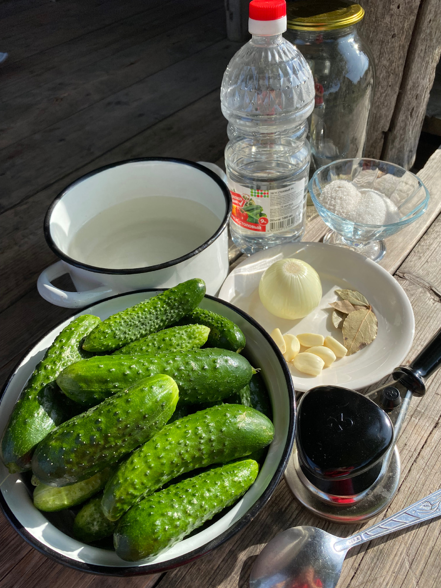 Сегодня познакомлю вас с новым рецептом сезонных закруточек - огурцы по-болгарски) Огурчики по этому рецепту получаются хрустящими и ароматными. И без стерилизации! Для приготовления нам понадобится: огурцы; 1 среднего размера луковица; 5-6 зубчиков чеснока; 5 шт. лаврового листа. Для маринада: 1 литр воды; 8 ч. л. сахара; 4 ч. л. соли; 8 ст. л. 9% уксуса. Набор и количество ингредиентов у меня на двухлитровую банку. Огурцы предварительно нужно помыть и замочить в холодной воде на 3 часа. В это время можно подготовить остальные продукты: чистим лук и чеснок. Моем банки и крышки. На дно банки укладываем чеснок, лавровый лист и лук, нарезанный кольцами. У огурцов срезаем края и плотно укладываем в банку. Банку с огурцами заливаем кипятком 2 раза: первый раз - минут на 10, второй раз - минут на 5. А в третий раз будем заливать уже маринадом. Маринад готовится очень просто: воду доводим до кипения и добавляем сахар и соль. Мешаем до полного растворения. А потом аккуратно вводим уксус. Дае