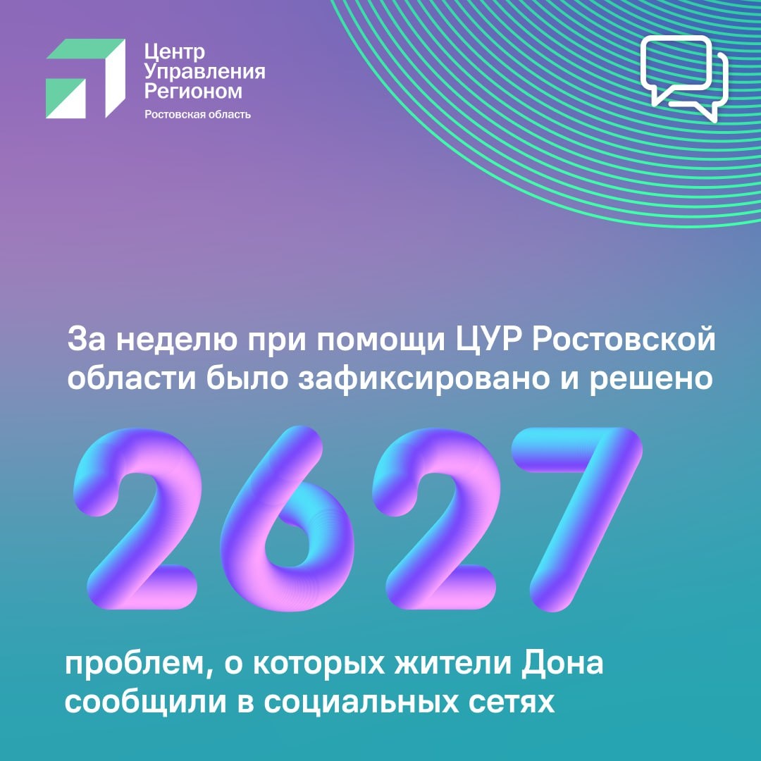 📊Настало время посмотреть статистику за неделю! 📱За этот период при участии Центра управления регионом Ростовской области было зафиксировано и решено 2627 проблем, о которых жители Дона сообщили в социальных сетях. Подробности узнаете из нашей инфографики➡️ #цур61 #решаемвместе61 #цурвцифрах #ростовскаяобласть